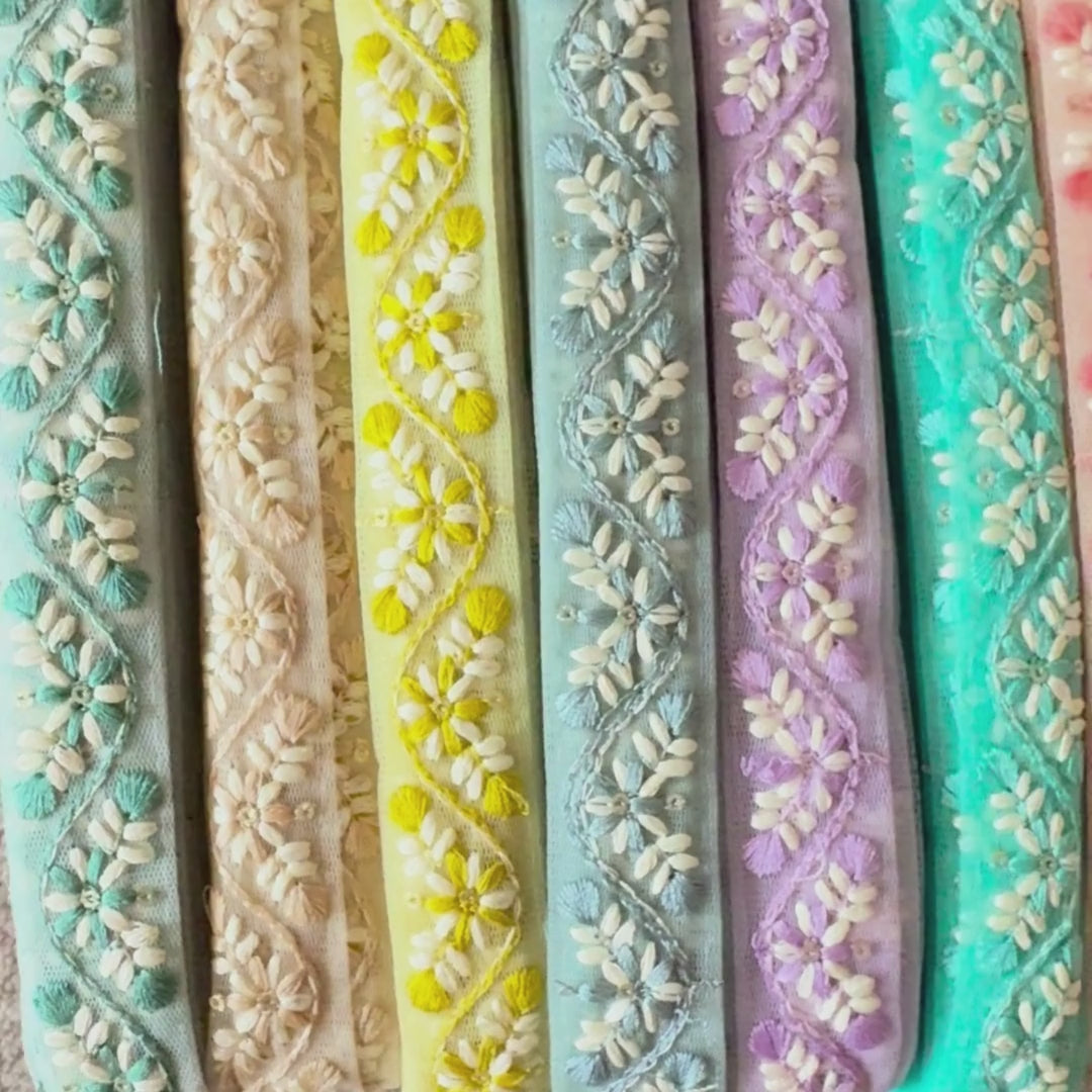 Crafted with care, this embroidery trim is designed on a soft net base, making it ideal for saree borders, dupattas, blouses, dresses, or even creative home décor. Whether you're enhancing a garment or designing a piece from scratch, this lace and trim is sure to inspire creativity.