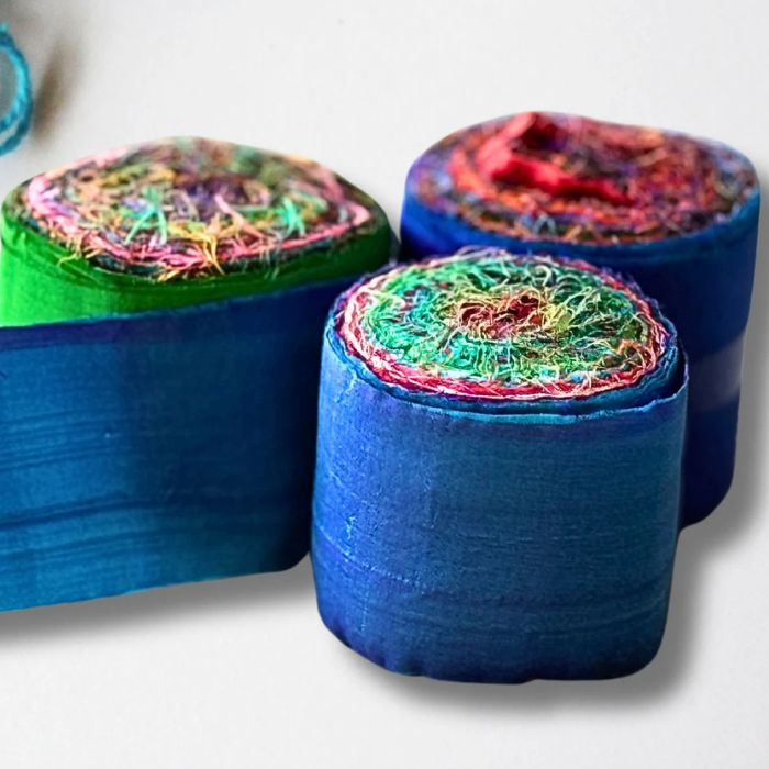 "Unravel the vibrant tales woven into our Sari Silk Ribbon Yarn Roll! Crafted from recycled sari silk, this eco-conscious gem transforms discarded beauty into luscious art yarn. With its multi mix jewel tone rich hues and textured allure, it beckons weavers, crocheters, and knitters alike to embark on a journey of creativity. Use as the perfect bow on top of a special gift. Whether adorning journals, crafting jewelry, or breathing life into textile art, our ribbon is a testament to sustainability and style. Embrace the magic of recycled elegance with every stitch and weave your own masterpiece today!"