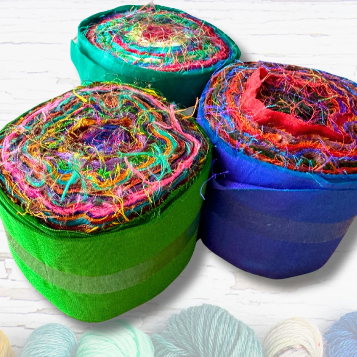 Sari Silk Ribbon Yarn Roll – Recycled Art Yarn in Multi Mix Jewel Tones (2" Width)
